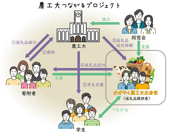 農工大つながるプロジェクトとは、2024年の創基150周年を機に、卒業生・在学生・教職員などのすべての農工大サポーターを、農工大を中心に相互につなぐプロジェクトです。 東京農工大学基金にご寄附いただいた方へ感謝を込めて、全国で魅力的な生産物・加工品等を作っている『かがやく農工大出身者(卒業生)』の商品をお贈りすることで、農工大サポーターを相互につなげていきます。 東京農工大学基金にいただいたご寄附は、国際社会で活躍する理工系人材の育成強化及び教育研究環境の整備充実を図るため、在学生への各種支援に活用してまいります。
